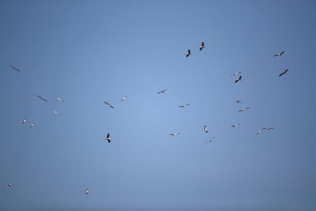 监测到这些东方白鹳时,它们在一股上升气流中越盘越高。由于距离较远,起初很难判断它们的种类,通过拍摄的照片才确认了这一惊喜发现。这次共监测到两群、总计51只东方白鹳。